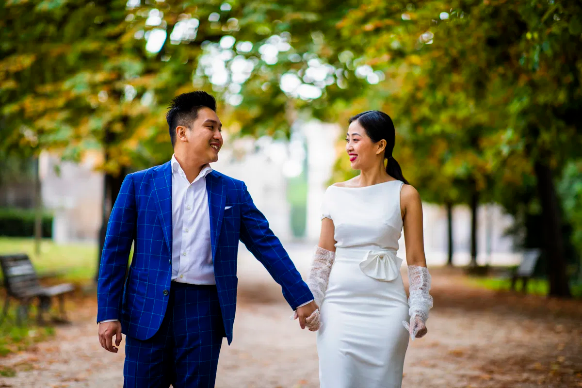 Another advantage of a well-planned route is the built-in recovery time. After a crowded landmark, a bridge, garden edge, or side street gives couples a minute to reset posture, adjust outfits, and forget the audience.