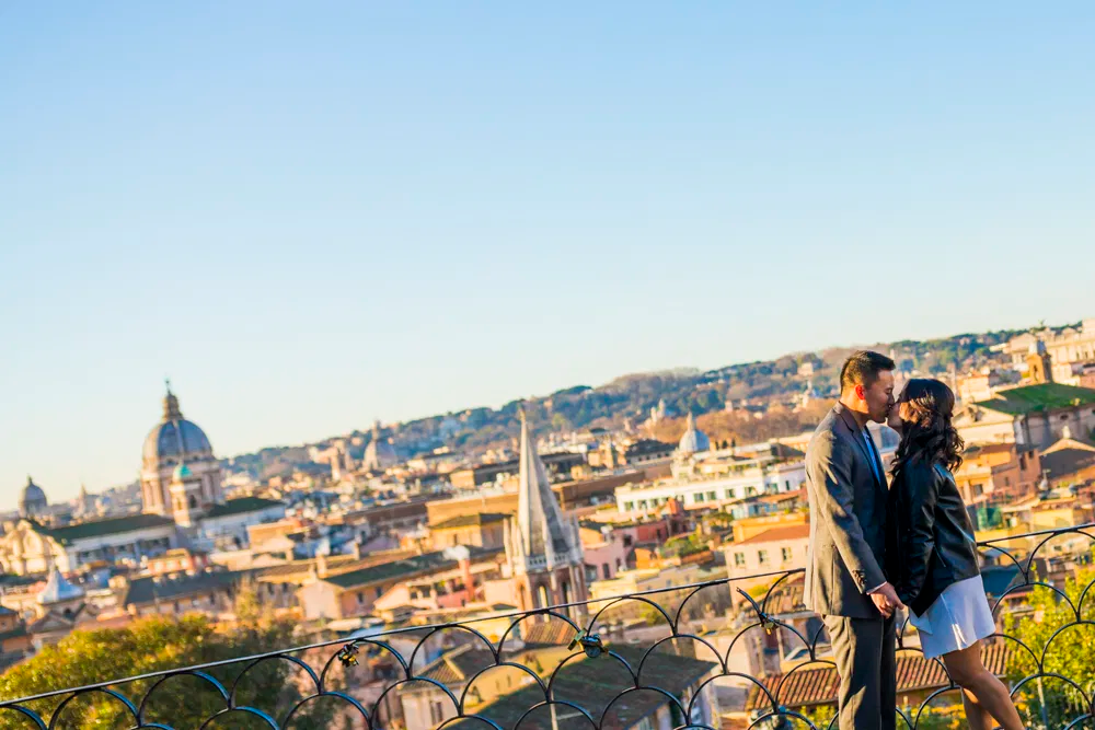 Pincio Terrace appears frequently in Gianfranco's proposal work for a simple reason: it photographs big emotions without making the couple feel exposed. The panorama - sweeping across domes, rooftops, and Piazza del Popolo below - reads clearly on camera, the terrace opens beautifully at sunrise, and there is enough physical space to breathe.